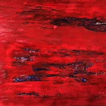 Ce tableau représente un enchevêtrement de chemins noirs, sinueux et désordonnés, symbolisant le chaos du quotidien. Des rectangles rouge vif jaillissent, incarnant une énergie brute et intense, contrastant avec l'oppression des lignes sombres. Des touches de bleu, fluides et sereines, percent l'obscurité, invitant à une échappée vers la liberté et l’apaisement.