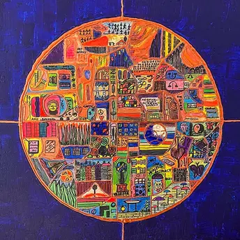 Nos horizons vertueux sont de doux rêves que j’aime exprimer. On peut poser un autre regard sur notre planète, sur les constellations, sur notre système solaire. Notre terre se dégrade, en proie à d’agressions multiples. L’envie de nous dire que notre avenir doit être vertueux, que les valeurs morales se doivent d’exister encore plus.La symbolique du cercle concentre les notions d’infini et d’éternité encadrée par ce jaune, symbole de fraternité et de joie. -100cmx100cm – Acryliques et encres