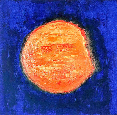 Ce tableau a été réalisé en Juillet 2018, aux dimensions de 80 cm x 80 cm. Dans la série des « Planets », j’ai réalisé celle-ci de manière un peu différente. Elle est en train d’imploser. Les couleurs sont vives inspirant le feu, l’incandescence -les bleus « noircis « par la chaleur.
